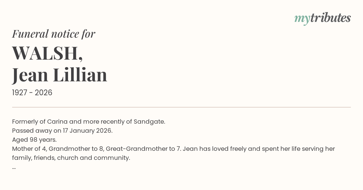 Relatives and friends are invited to attend Jean's service to be held at 10am on Friday 23 January, 2026 at Sandgate Uniting Church, 116 Board St, Deagon.