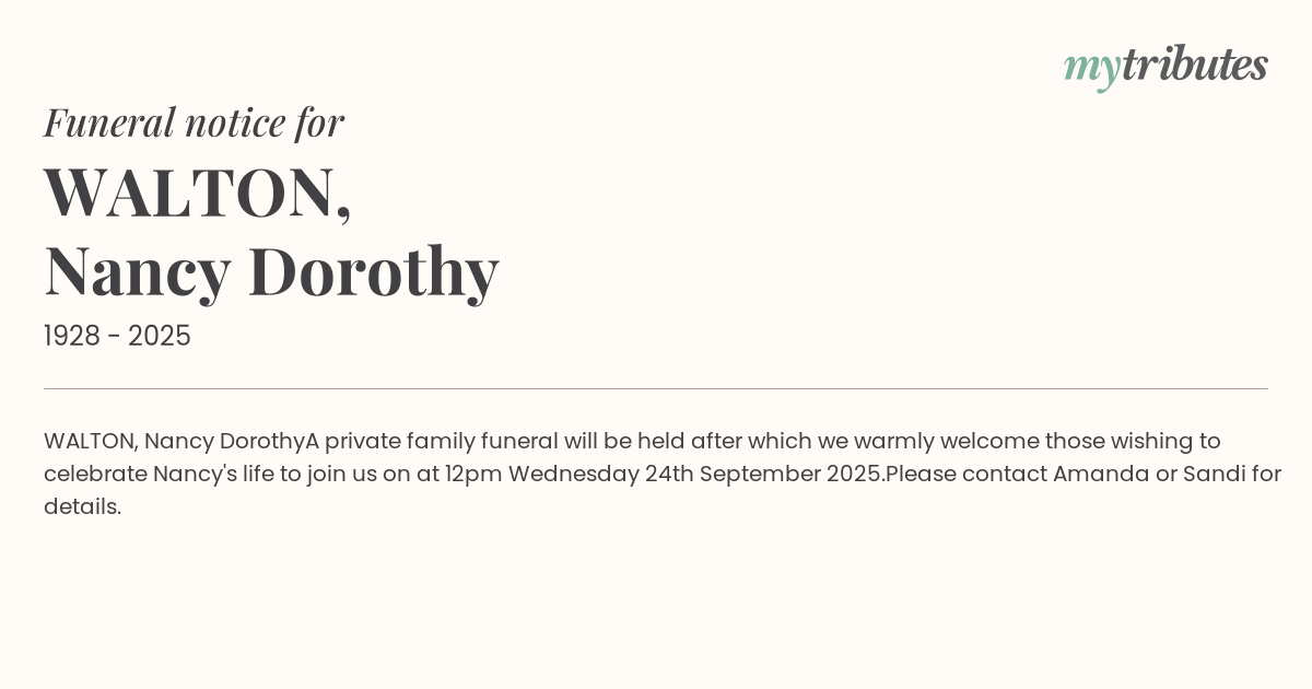 A private family funeral will be held after which we warmly welcome those wishing to celebrate Nancy's life to join us on at 12pm Wednesday 24th September 2025.