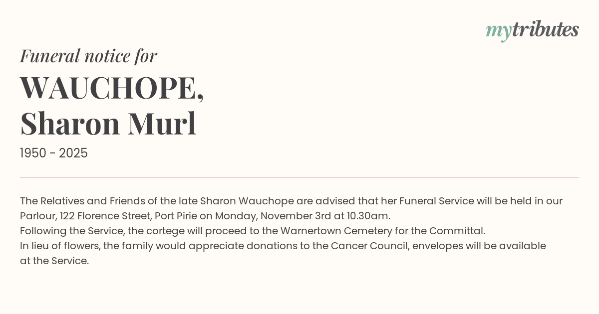 The Relatives and Friends of the late Sharon Wauchope are advised that her Funeral Service will be held in our Parlour, 122 Florence Street, Port Pirie on Monday, November 3rd at 10.30am.