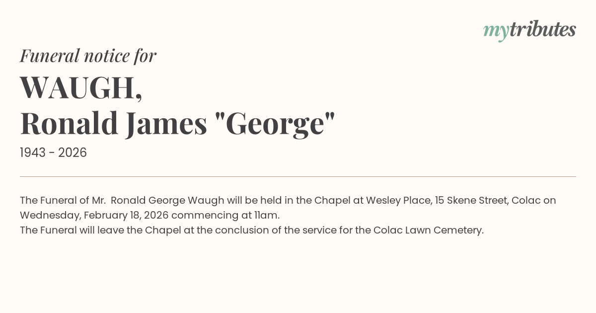 The Funeral of Mr. Ronald “George” Waugh will be held in the Chapel at Wesley Place, 15 Skene Street, Colac on Wednesday, February 18, 2026 commencing at 11am.