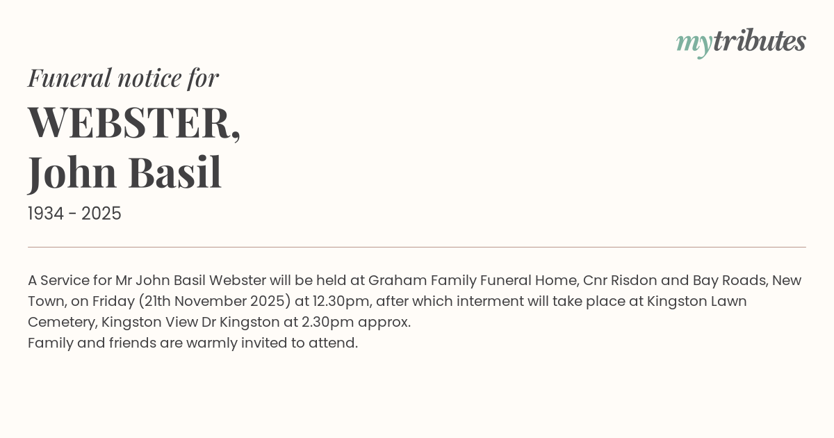 A Service for Mr John Basil Webster will be held at Graham Family Funeral Home, Cnr Risdon and Bay Roads, New Town, on Friday (21th November 2025) at 12.30pm, after which interment will take place at Kingston Lawn Cemetery, Kingston View Dr Kingston at 2.30pm approx.