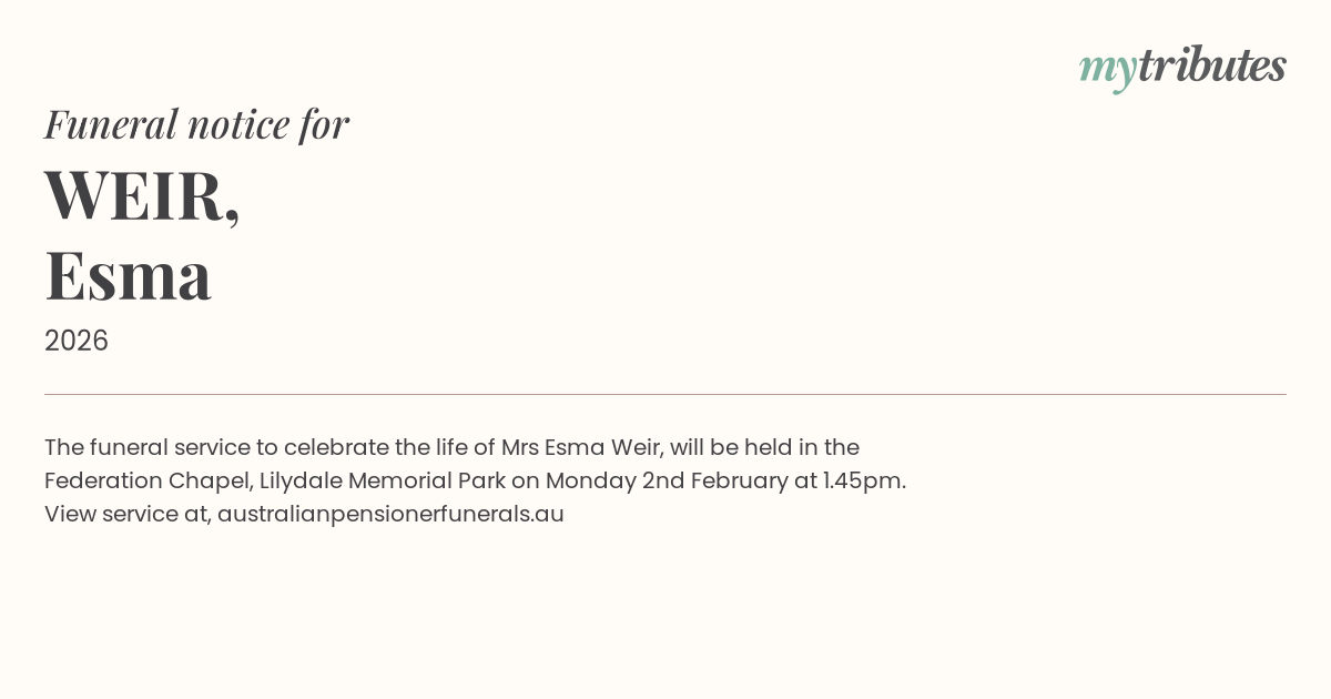 The funeral service to celebrate the life of Mrs Esma Weir, will be held in the