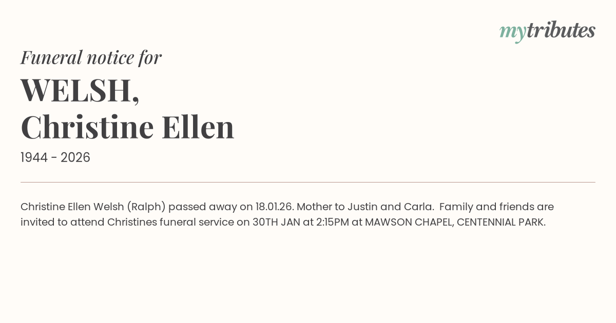Christine Ellen Welsh (Ralph) passed away on 18.01.26. Mother to Justin and Carla. Family and friends are invited to attend Christine’s funeral service on 30TH JAN at 2:15PM at MAWSON CHAPEL, CENTENNIAL PARK.
