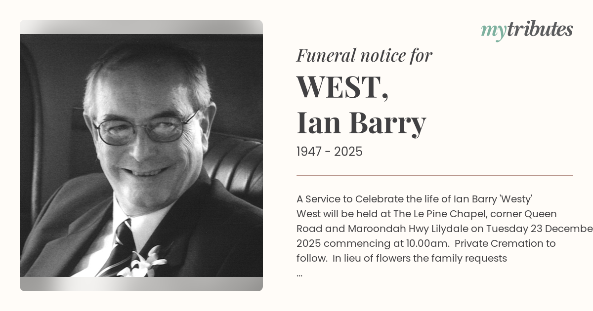 A Service to Celebrate the life of Ian Barry 'Westy' West will be held at The Le Pine Chapel, corner Queen Road and Maroondah Hwy Lilydale on Tuesday 23 December 2025 commencing at 10.00am. Private Cremation to follow. In lieu of flowers the family requests donations to Dementia Australia.