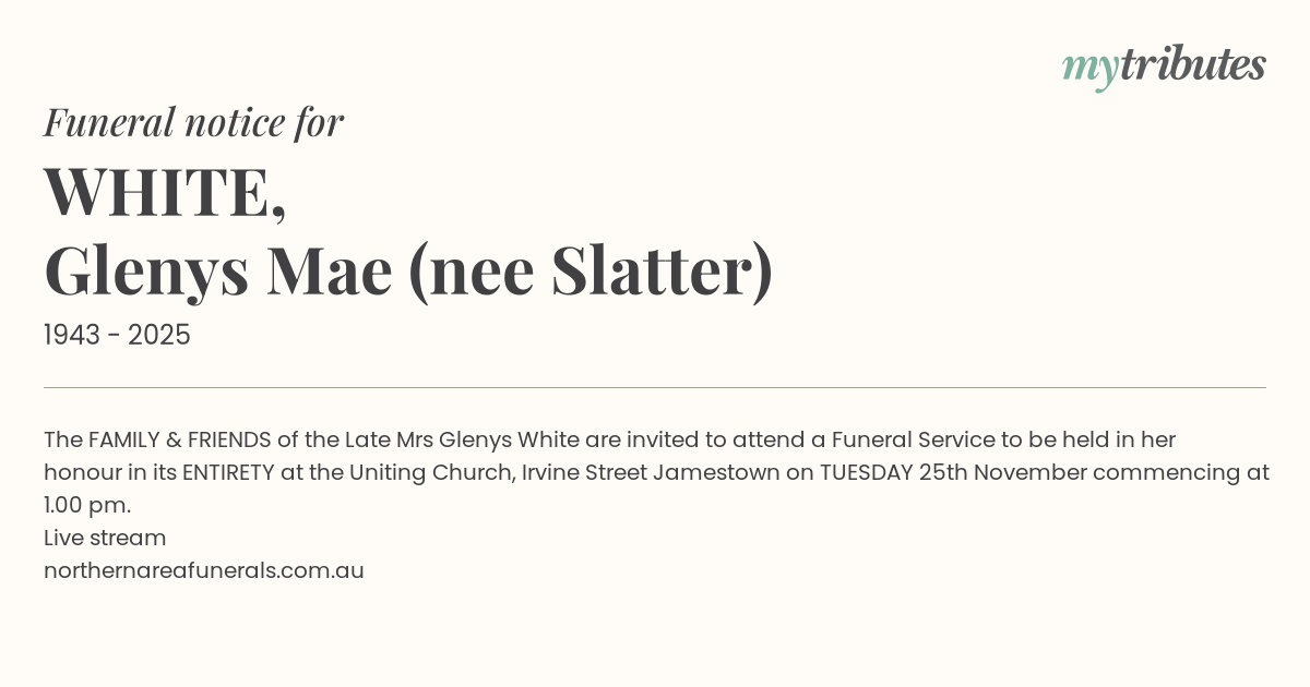 The FAMILY & FRIENDS of the Late Mrs Glenys White are invited to attend a Funeral Service to be held in her honour in its ENTIRETY at the Uniting Church, Irvine Street Jamestown on TUESDAY 25th November commencing at 1.00 pm.
