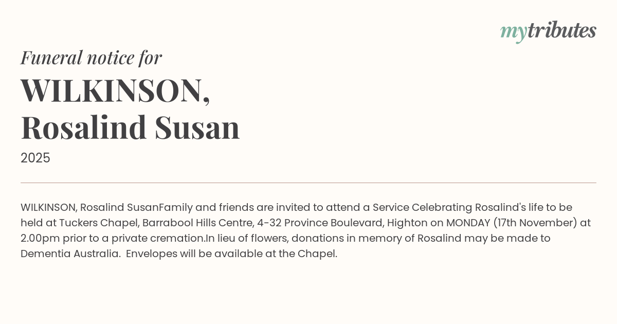 Family and friends are invited to attend a Service Celebrating Rosalind's life to be held at Tuckers Chapel, Barrabool Hills Centre, 4-32 Province Boulevard, Highton on MONDAY (17th November) at 2.00pm prior to a private cremation.
