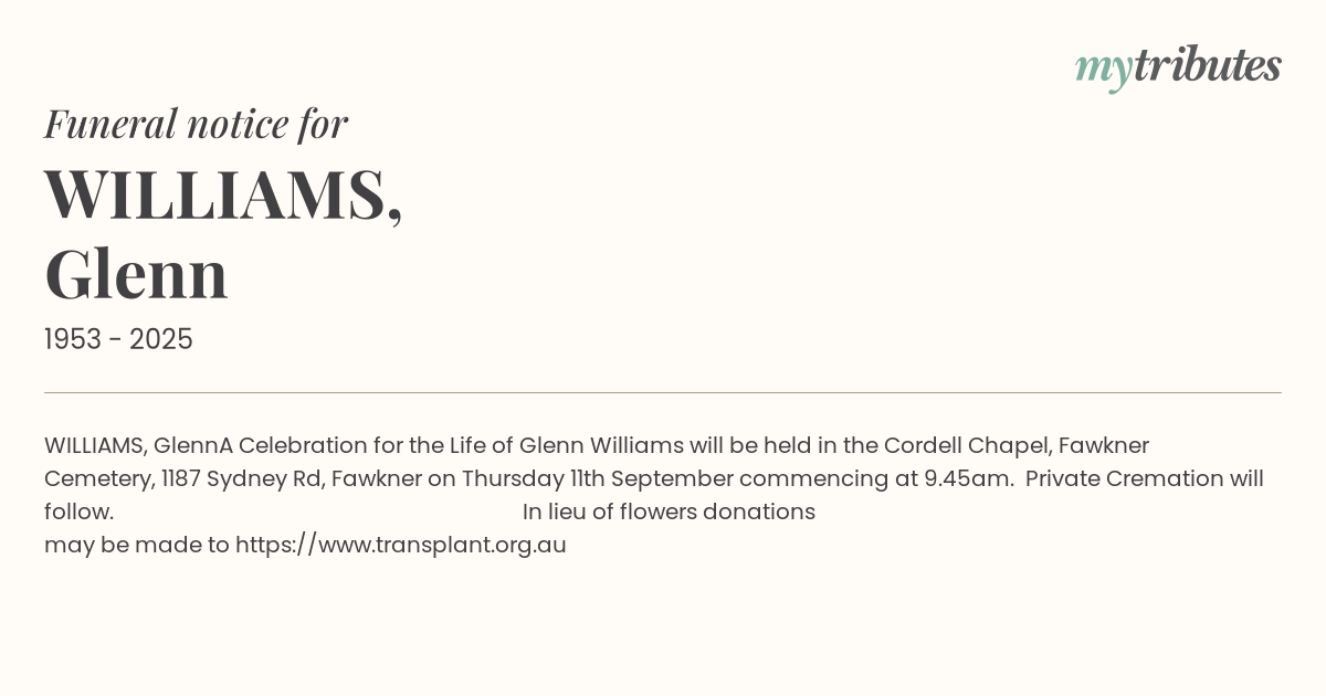 A Celebration for the Life of Glenn Williams will be held in the Cordell Chapel, Fawkner Cemetery, 1187 Sydney Rd, Fawkner on Thursday 11th September commencing at 9.45am. Private Cremation will follow. In lieu of flowers donations may be made to https://www.transplant.org.au
