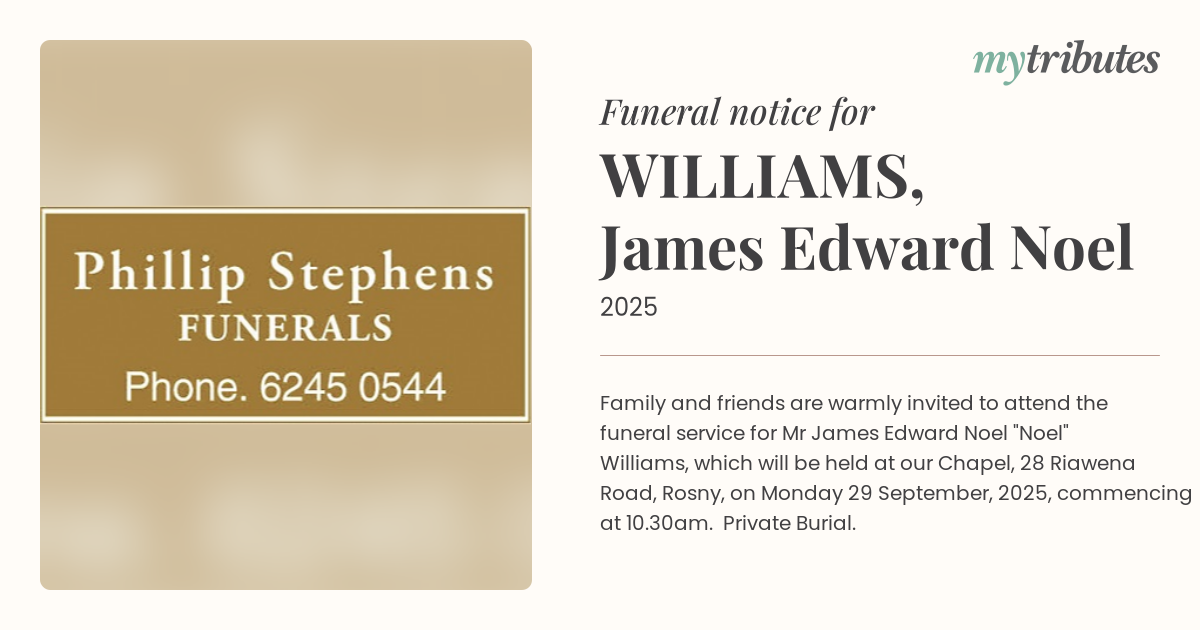 Family and friends are warmly invited to attend the funeral service for Mr James Edward Noel "Noel" Williams, which will be held at our Chapel, 28 Riawena Road, Rosny, on Monday 29 September, 2025, commencing at 10.30am. Private Burial.