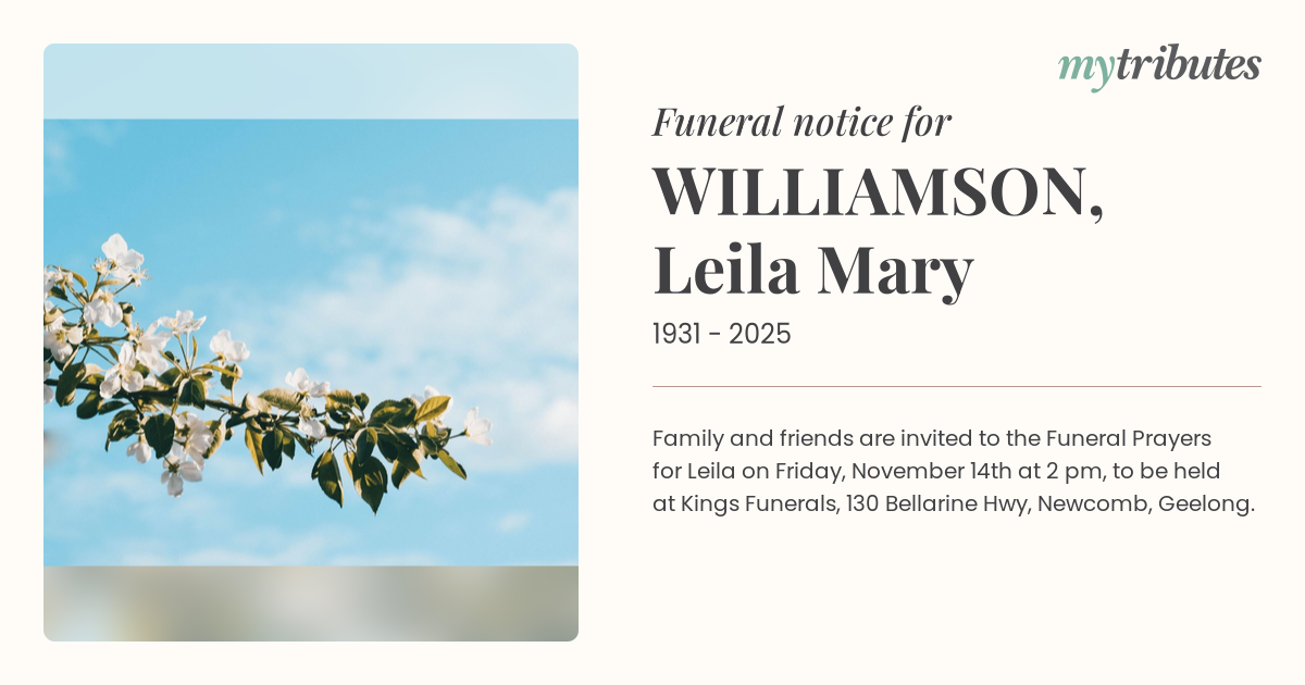 Family and friends are invited to the Funeral Prayers for Leila on Friday, November 14th at 2 pm, to be held at Kings Funerals, 130 Bellarine Hwy, Newcomb, Geelong.