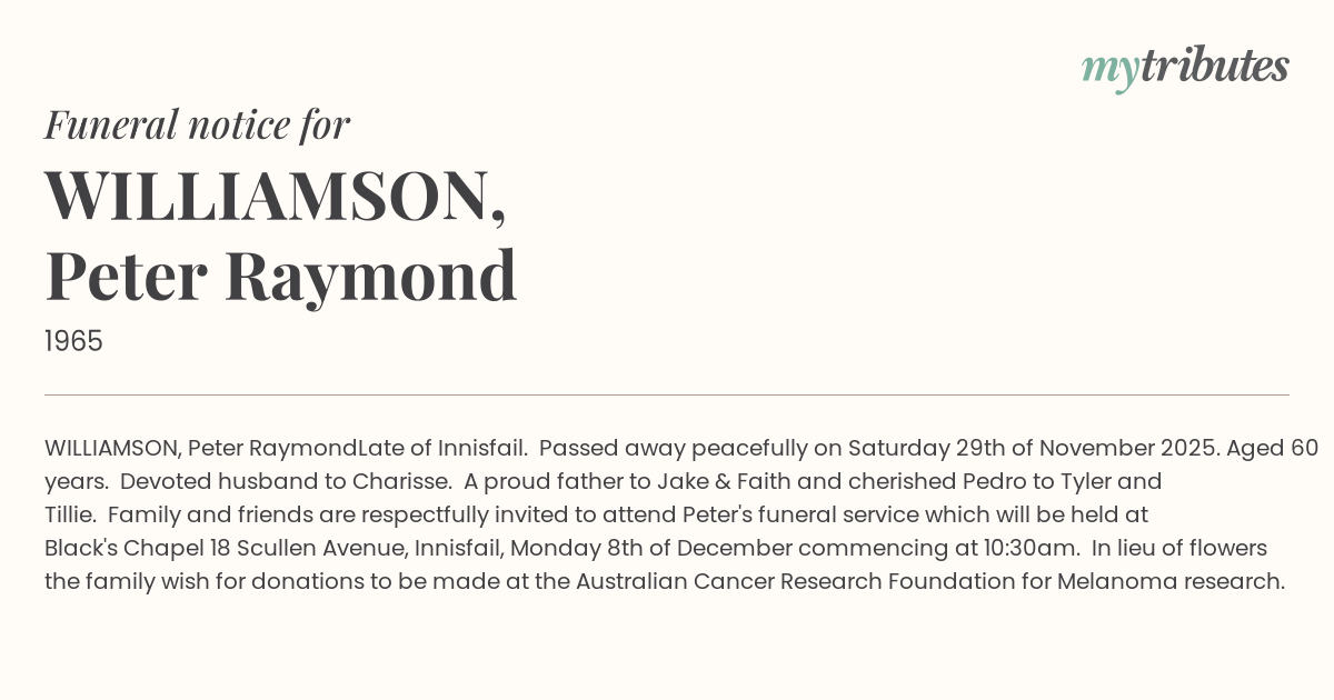 In lieu of flowers the family wish for donations to be made at the Australian Cancer Research Foundation for Melanoma research.