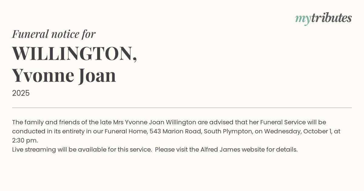 The family and friends of the late Mrs Yvonne Joan Willington are advised that her Funeral Service will be conducted in its entirety in our Funeral Home, 543 Marion Road, South Plympton, on Wednesday, October 1, at 2:30 pm.