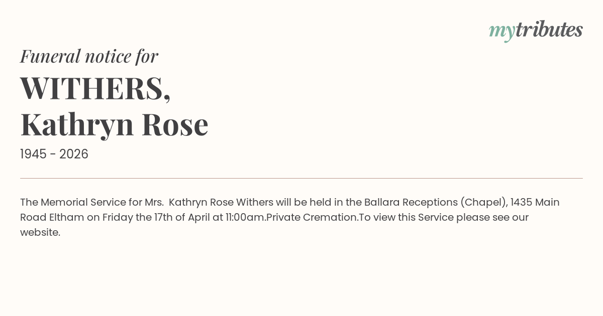 The Memorial Service for Mrs. Kathryn Rose Withers will be held in the Ballara Receptions (Chapel), 1435 Main Road Eltham on Friday the 17th of April at 11:00am.