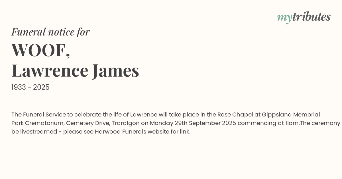 The Funeral Service to celebrate the life of Lawrence will take place in the Rose Chapel at Gippsland Memorial Park Crematorium, Cemetery Drive, Traralgon on Monday 29th September 2025 commencing at 11am.