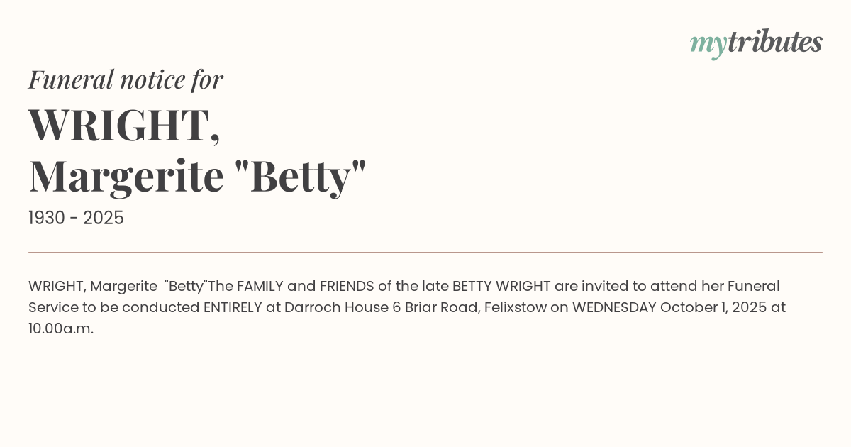 The FAMILY and FRIENDS of the late BETTY WRIGHT are invited to attend her Funeral Service to be conducted ENTIRELY at Darroch House 6 Briar Road, Felixstow on WEDNESDAY October 1, 2025 at 10.00a.m.
