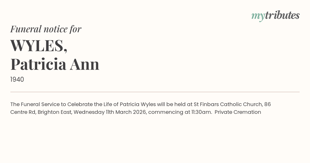 The Funeral Service to Celebrate the Life of Patricia Wyles will be held at St Finbars Catholic Church, 86 Centre Rd, Brighton East, Wednesday 11th March 2026, commencing at 11:30am. Private Cremation