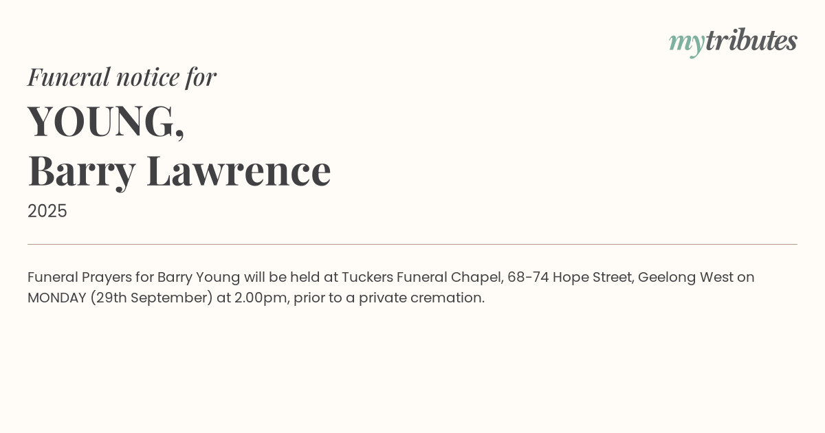 Funeral Prayers for Barry Young will be held at Tuckers Funeral Chapel, 68-74 Hope Street, Geelong West on MONDAY (29th September) at 2.00pm, prior to a private cremation.