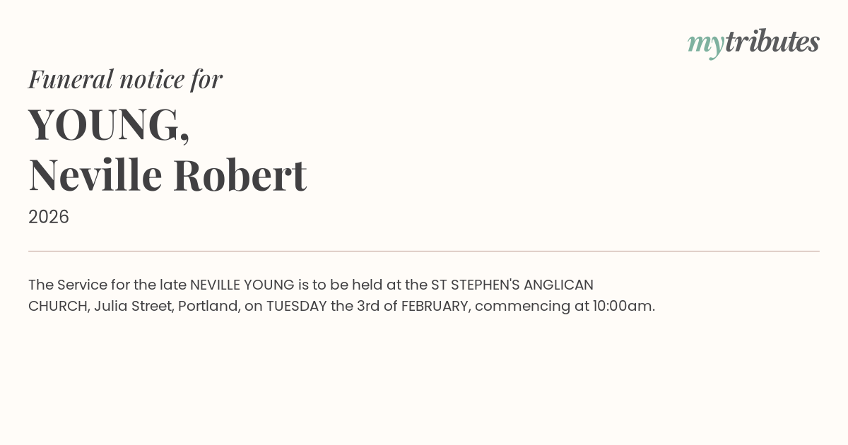 The Service for the late NEVILLE YOUNG is to be held at the ST STEPHEN'S ANGLICAN