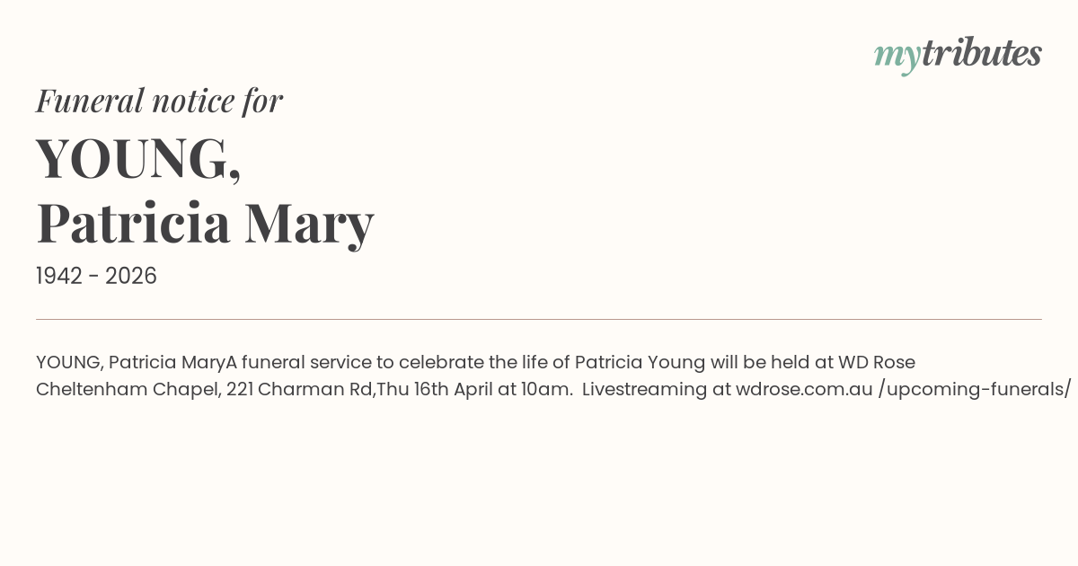 A funeral service to celebrate the life of Patricia Young will be held at WD Rose Cheltenham Chapel, 221 Charman Rd,