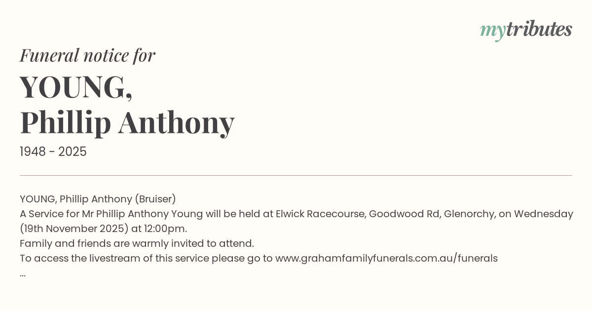 A Service for Mr Phillip Anthony Young will be held at Elwick Racecourse, Goodwood Rd, Glenorchy, on Wednesday (19th November 2025) at 12:00pm.