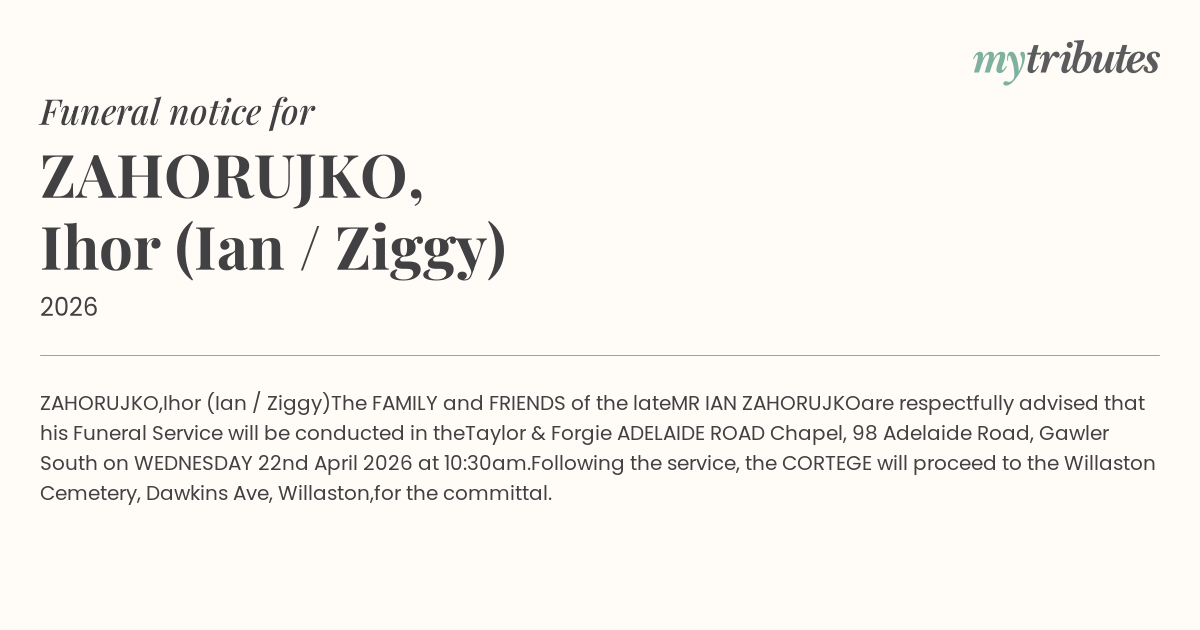 Taylor & Forgie ADELAIDE ROAD Chapel, 98 Adelaide Road, Gawler South on WEDNESDAY 22nd April 2026 at 10:30am.