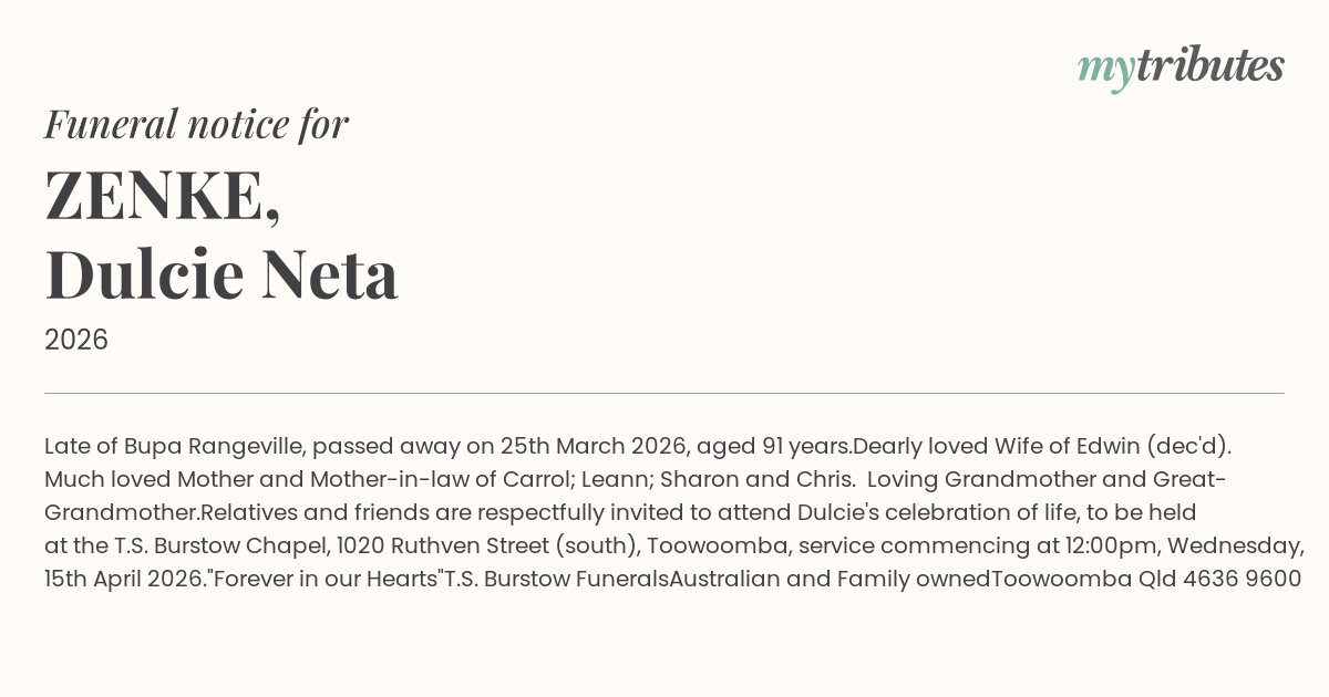Relatives and friends are respectfully invited to attend Dulcie's celebration of life, to be held at the T.S. Burstow Chapel, 1020 Ruthven Street (south), Toowoomba, service commencing at 12:00pm, Wednesday, 15th April 2026.